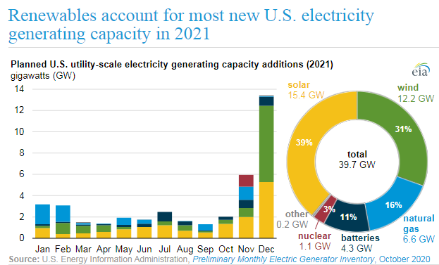 La Administración de Información Energética de Estados Unidos (EIA) anunció el 12 de enero que en 2021, el país Generación de energía solar a escala de servicios públicos Se espera que la capacidad aumente en 15,4 GW, estableciendo un nuevo récord para EE. UU. generación de energía de la red capacidad.